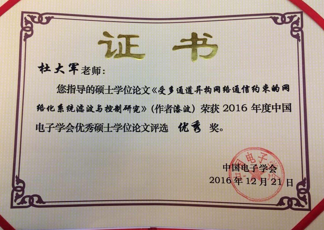中国电子学会于12月21日在北京万寿宾馆举行表彰会,机自学院杜大军副研究员指导的硕士研究生漆波的学位论文《受多通道异构网络通信约束的网络化系统滤波与控制研究》获得2016年度中国电子学会优秀硕士学位论文奖。