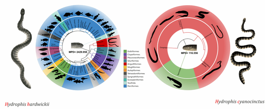 青环海蛇与平颏海蛇不同的捕食生态系统发育情况