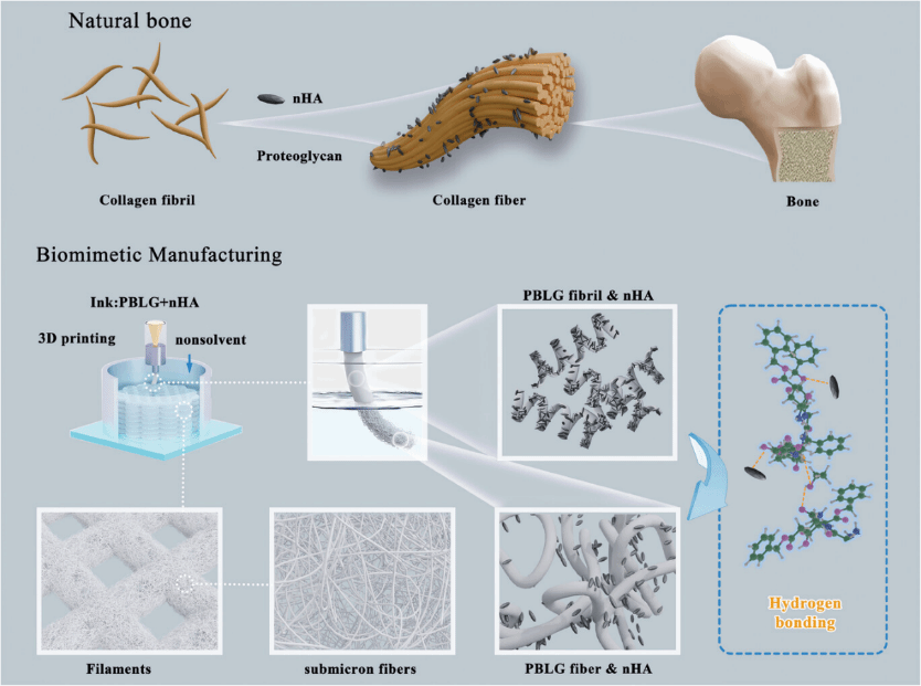 通过先进增材制造技术制造具有仿生结构的人工骨对理解骨组织结构-性能以及骨组织再生具有重要意义。由于3D打印对墨水流变学性能要求苛刻,通过3D打印构建具有仿生纤维结构的人工骨面临巨大挑战,目前相关报道鲜见。受骨组织中多层次纤维结构和有机无机复合特征的启发,材料学院尹静波教授、张坤玺教授基于聚(L-谷氨酸苄酯)(PBLG)在成螺溶剂中的自组装特性,提出一种非溶剂辅助3D打印方法,在实现PBLG基复合材料3D打印的同时一步法生成仿生纤维结构,以模拟天然骨组织中胶原纤维束的形成(见图1)。研究成果发表在《Advanced Functional Materials》期刊(影响因子:18.500),论文题目为“Biomimetic Fibrous Bone Substitute Manufacture through Non-Solvent-Assisted 3D Printing”,国产亚洲精品美女久久久为第一作者和第一通讯作者单位。该工作得到国家重点研发计划(2023YFC2412300)、国家自然科学基金项目(52373146, 5217313)和上海市自然科学基金(22ZR1424700, 22ZR1454900)的资助。