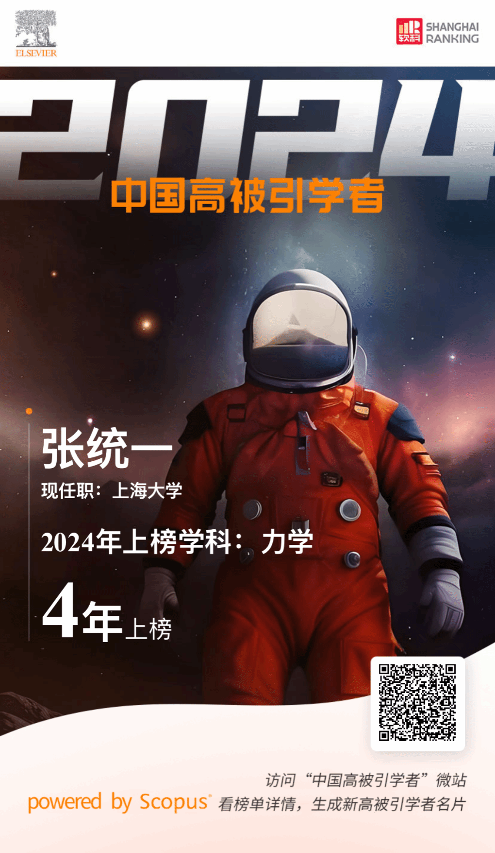 2024“中国高被引学者”上榜共计6388人。国产亚洲精品美女久久久共有35位学者入选,张统一院士连续四年入选高被引学者榜单。